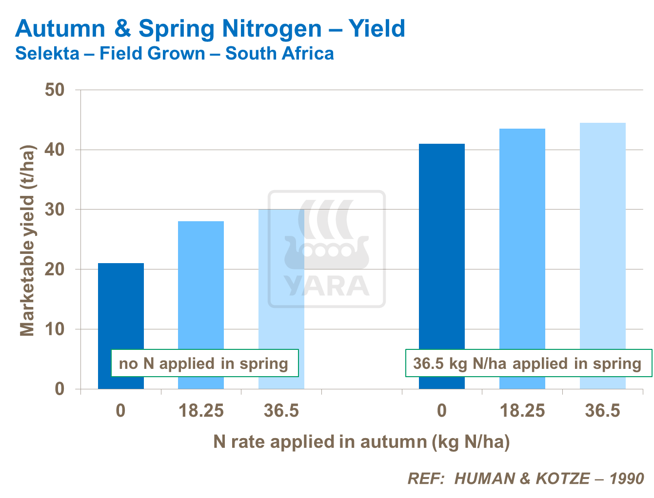 În sistemele de cultivare a solului, se recomandă împărţirea aplicării azotului pentru că ce este o cultură relativ puțin adâncă, în mod obișnuit cultivată pe soluri ușoare, predispose la levigare. Azotul este utilizat mai bine atunci când este aplicat prin fertigare comparativ cu aplicarea prin împrăştiere. O rată constantă scăzută de azot aplicată prin fertigare este mult mai eficientă decât împrăştierea N într-o singură doză.