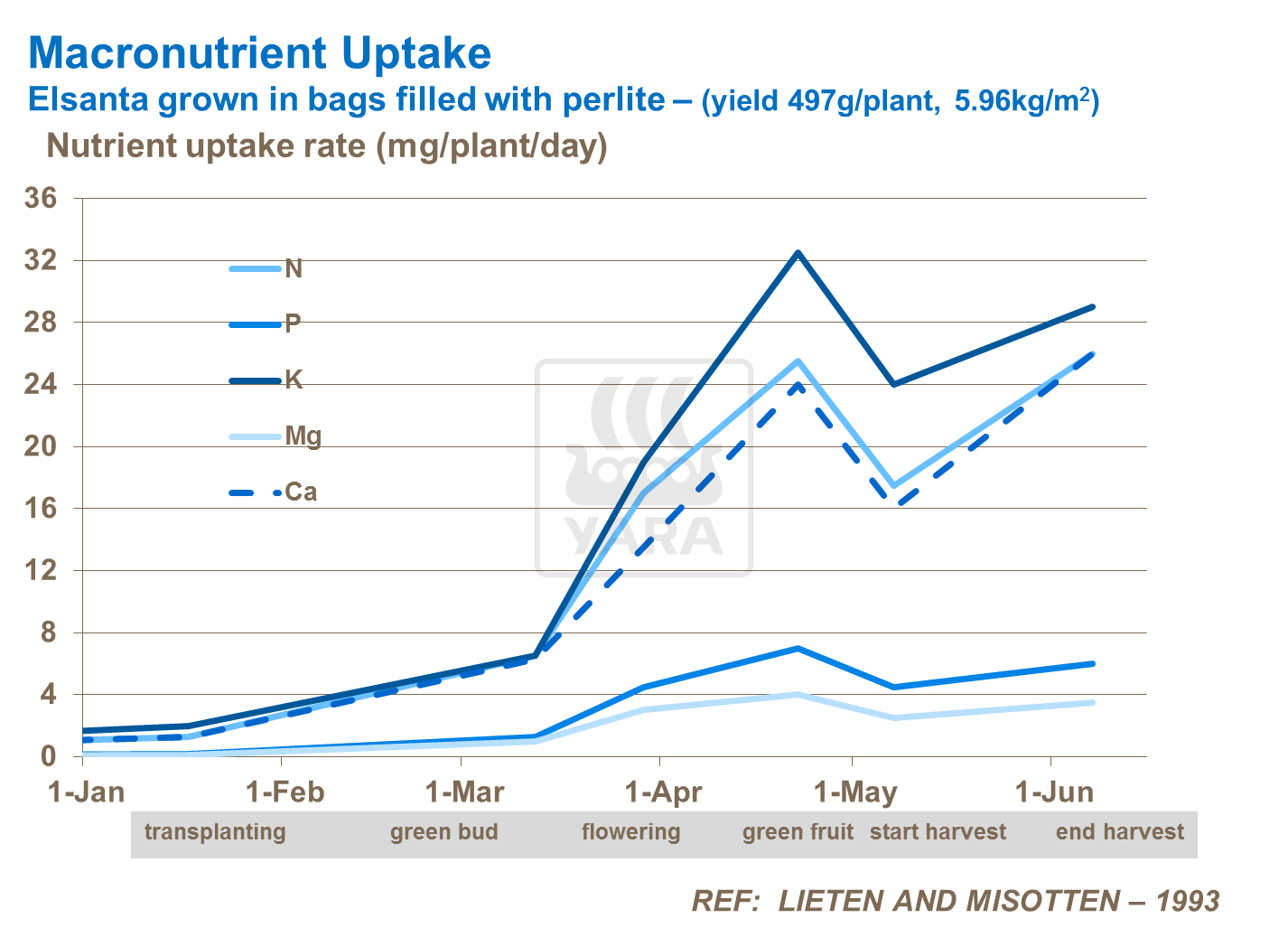 Cifrele de absorbție confirmă faptul că sunt necesare aproximativ 3-3,5 kg de azot pe tona de fructe. Consumul de azot crește în timpul etapei vegetative și atinge un vârf chiar înainte de începerea maturizării fructului. Sistemele perene pot utiliza rezervele de N deținute în colet și rădăcini, peste 2-3 ani de producție ca urmare a remobilizării în primăvară. Astfel, sistemele anuale de producție necesită în mod obișnuit și, prin urmare, beneficiază de rate mai mari de N decât sistemele perene. Bazându-se pe aplicările de toamnă, nu se va maximiza producția în primăvară. Aplicările de primăvară ale azotului sunt esențiale pentru a maximiza producţia, dar ele nu pot compensa suficient dacă ratele de aplicare din toamnă au fost prea mici.