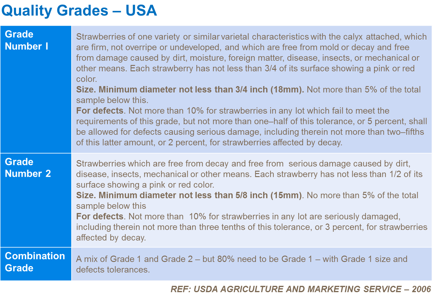 Majoritatea țărilor au specificate clase sau standarde pentru cultura de căpşuni. Clasa superioară este, în general, mai uniformă și cuprinde fructe mai mari, cu defecte minime. De asemenea, acestea trebuie să fie libere de boli. Manipularea și depozitarea sunt critice, iar pierderile mari și durata de păstrare redusă apar ca urmare a putrezirilor și a descompunerilor.