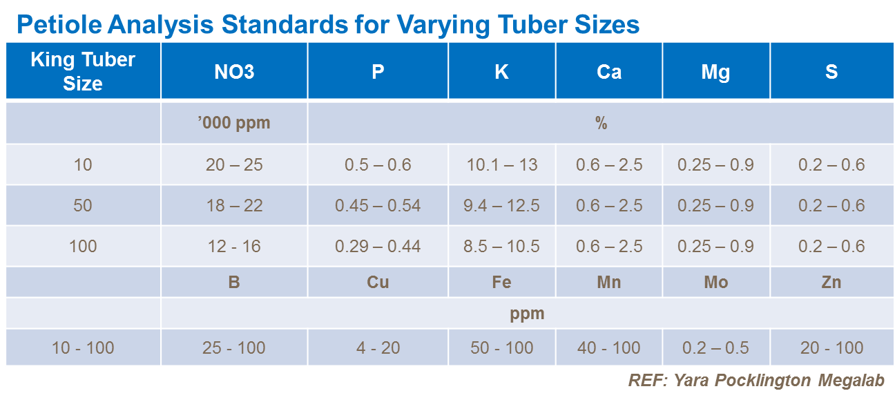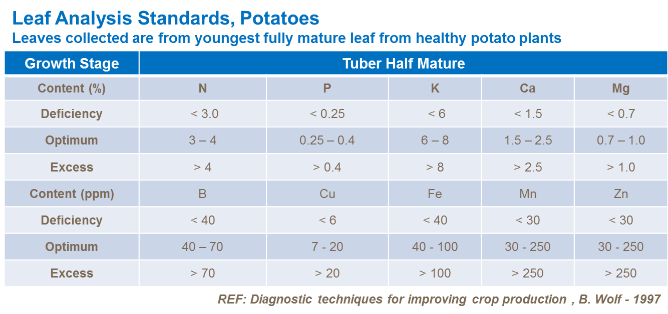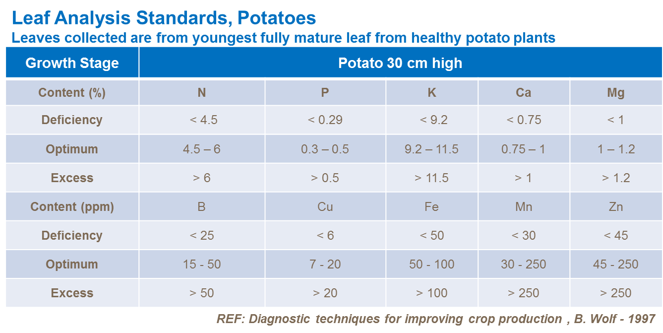 Analiza ţesuturilor (din peţiol sau frunză întreagă) oferă o imagine exactă în perioada de cultivare cu privire la situaţia nutrienţilor plantei, respectiv dereglările şi deficienţele de nutrienţi, în principal probabilitatea carenţelor de microelemente nutritive. Vezi în tabelul de mai jos: