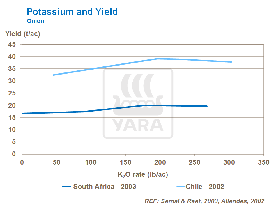 Potasiul este deasemenea un nutrient important pentru asigurarea unei recolte ridicate în cazul cepei şi usturoiului. Este un nutrient cu utilizarea aproape cea mai mare. Potasiul este necesar în cantitatea cea mai mare la formarea şi dezvoltarea bulbului. Cu toate acestea, trebuie tratat cu precauție, deoarece utilizarea excesivă poate duce la scăderi de randament.