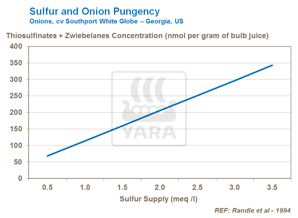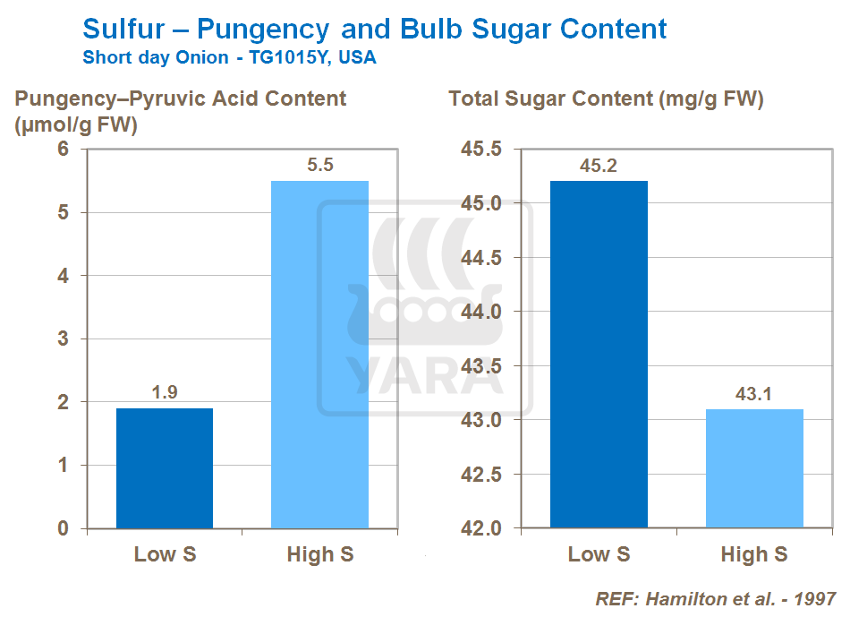 Sulful are un efect sesizabil şi în privinţa conţinutului de zahăr din ceapă. Din acest motiv trebuie luate în considerare ca şi elemente a programului de îngrijire nutriţională tipul solului şi aplicarea sulfului, în scopul satisfacerii cerinţelor de pe piață. De exemplu, pentru ceapa dulce este favorabilă un sol cu conținut scăzut de sulf, şi utilizarea unui îngrășământ cu conţinut redus de sulf, unde cea mai mare parte a sulfului este livrat la începutul sezonului de creștere, pentru a se asigura că bulbul îl absoarbe într-o cantitate minimă.