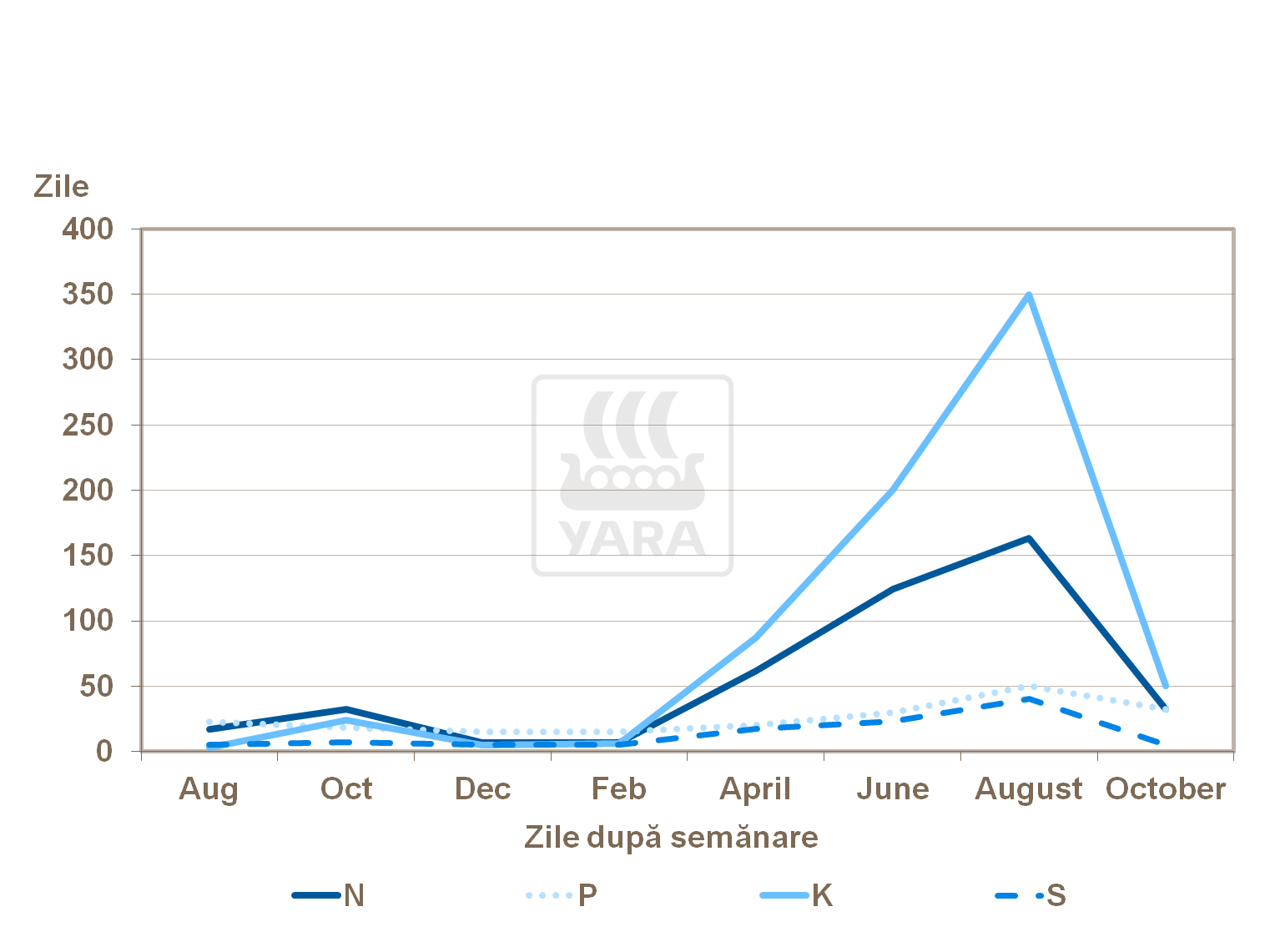 Primăvara, când începe creşterea plantei (la 6–7 luni după semănat), necesarul zilnic de nutrienţi va fi înmulţit odată cu dezvoltarea biomasei. Necesarul de azot, fosfat, potasiu şi sulf va fi foarte mare, deci aplicările multiple de nutrienţi trebuie efectuate în aşa fel încât să coincidă cu acest necesar. Creşterea şi dezvoltarea rapidă va necesita o rată mai mare de absorbţie a micronutrienţilor. Astfel vor apărea deficienţe ocazionale care trebuie soluţionate cu micronutrienţi foliari (produse YaraVita). Manganul, zincul, cuprul şi magneziul trebuie aplicate toate în această etapă a creşterii.