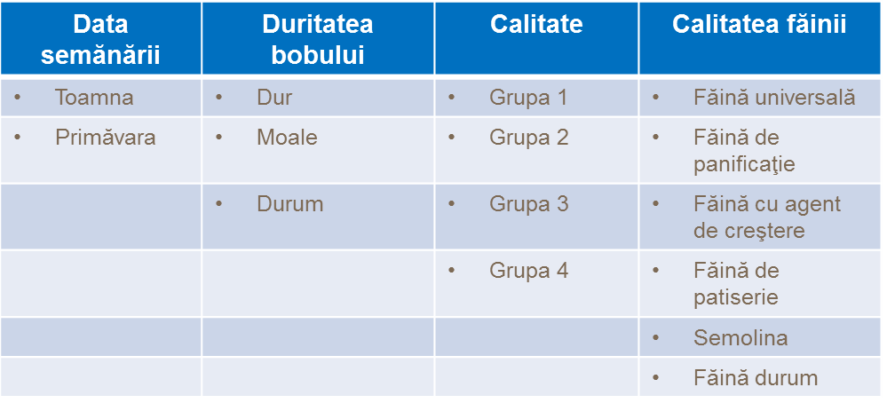Soiurile de grâu pot fi clasificate în funcţie de calitatea bobului:
