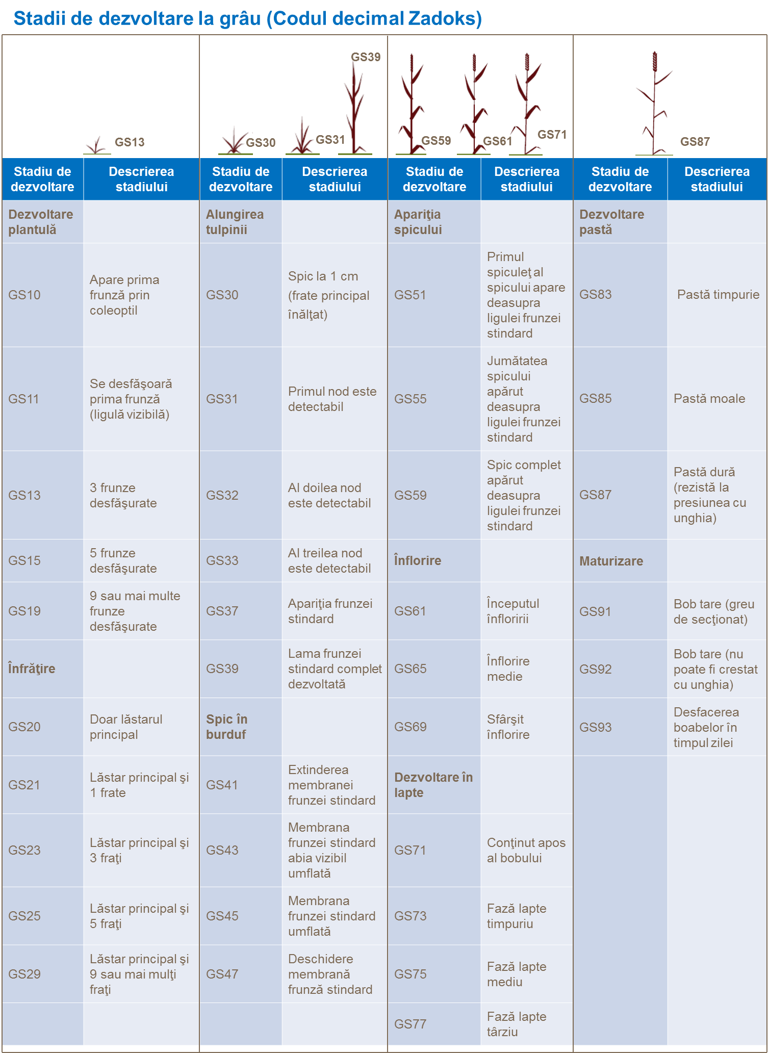 Dezvoltarea grâului poate fi descrisă mai amănunţit utilizând numeroase sisteme definite de-a lungul anilor. De obicei se folosesc trei dintre acestea, sistemele Zadoks, Feekes şi Haun, Zadoks fiind cel mai răspândit pentru a susţine deciziile legate de gestionarea aporturilor. Vedeţi mai jos detaliile sistemului.