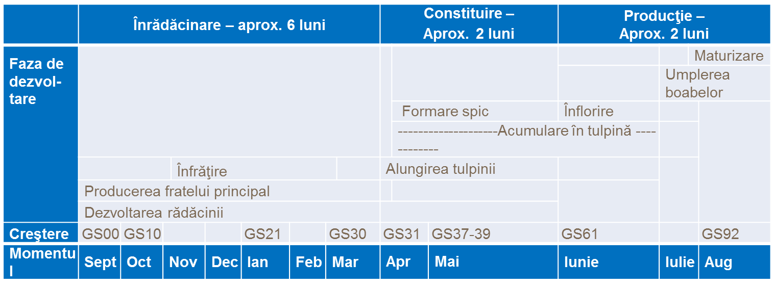 Cultura de grâu trece prin trei stadii distincte de dezvoltare de la semănat până la recoltă. Acestea sunt următoarele: