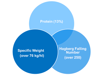 Gradul de calitate a grâului va depinde de specificațiile cerute de utilizatorul final, de exemplu,hrană pentru animale sau măcinare pentru făină de pâine,biscuiti,produse de patiserie,etc. Principalele trăsături care trebuie luate în considerare sunt proteina,greutatea hectolitrica, numărul de cădere Hagberg (HFN) și conținutul de amidon.
