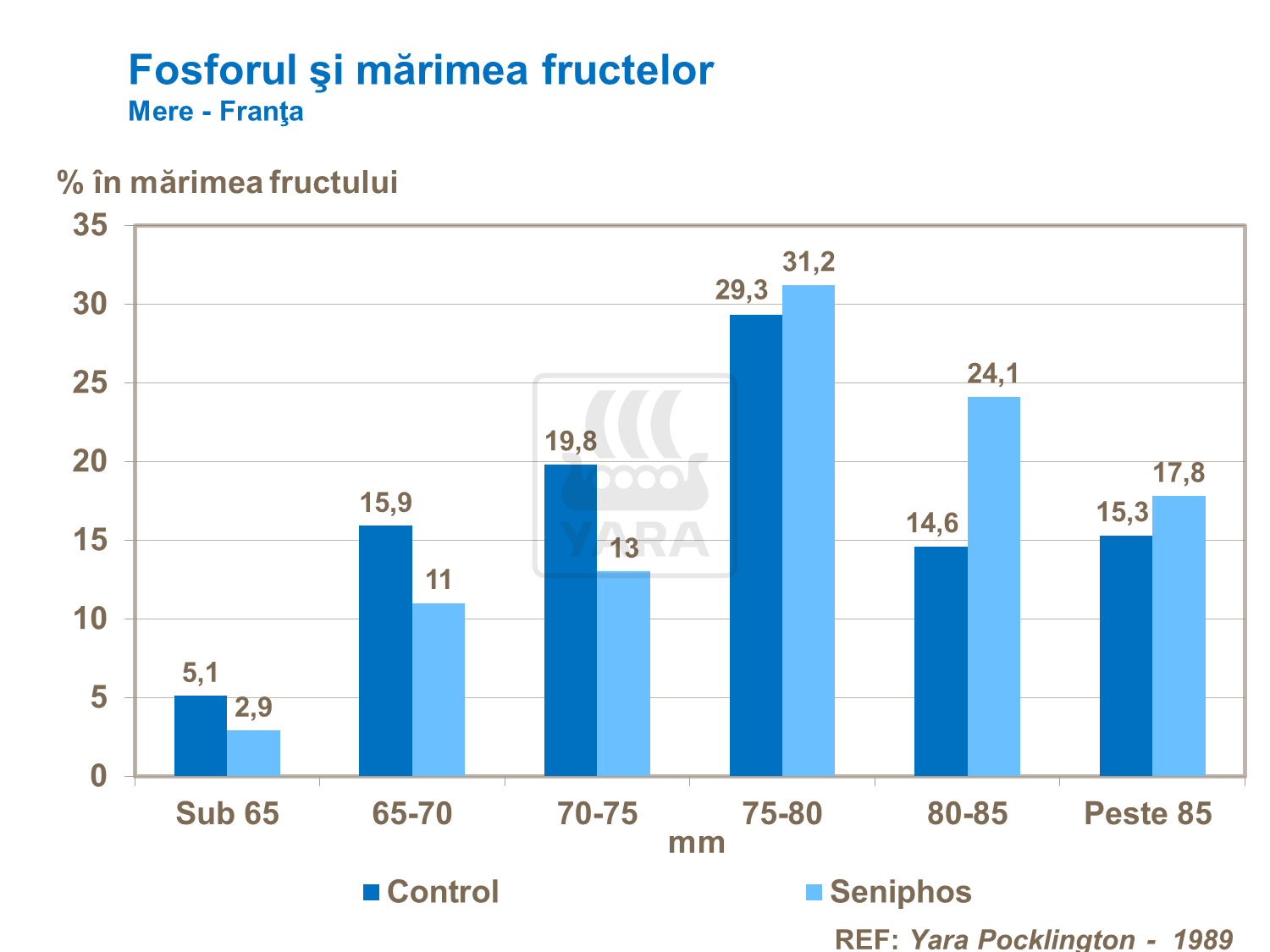 Studiile franceze au arătat că fosforul este capabil de a crește dimensiunea merelor cu 24%. Astfel, este deosebit de important să se asigure că rezervele nu sunt limitate în următoarele șase săptămâni după înflorire. Acestaeste cel mai simplu accesibil de la frunze.