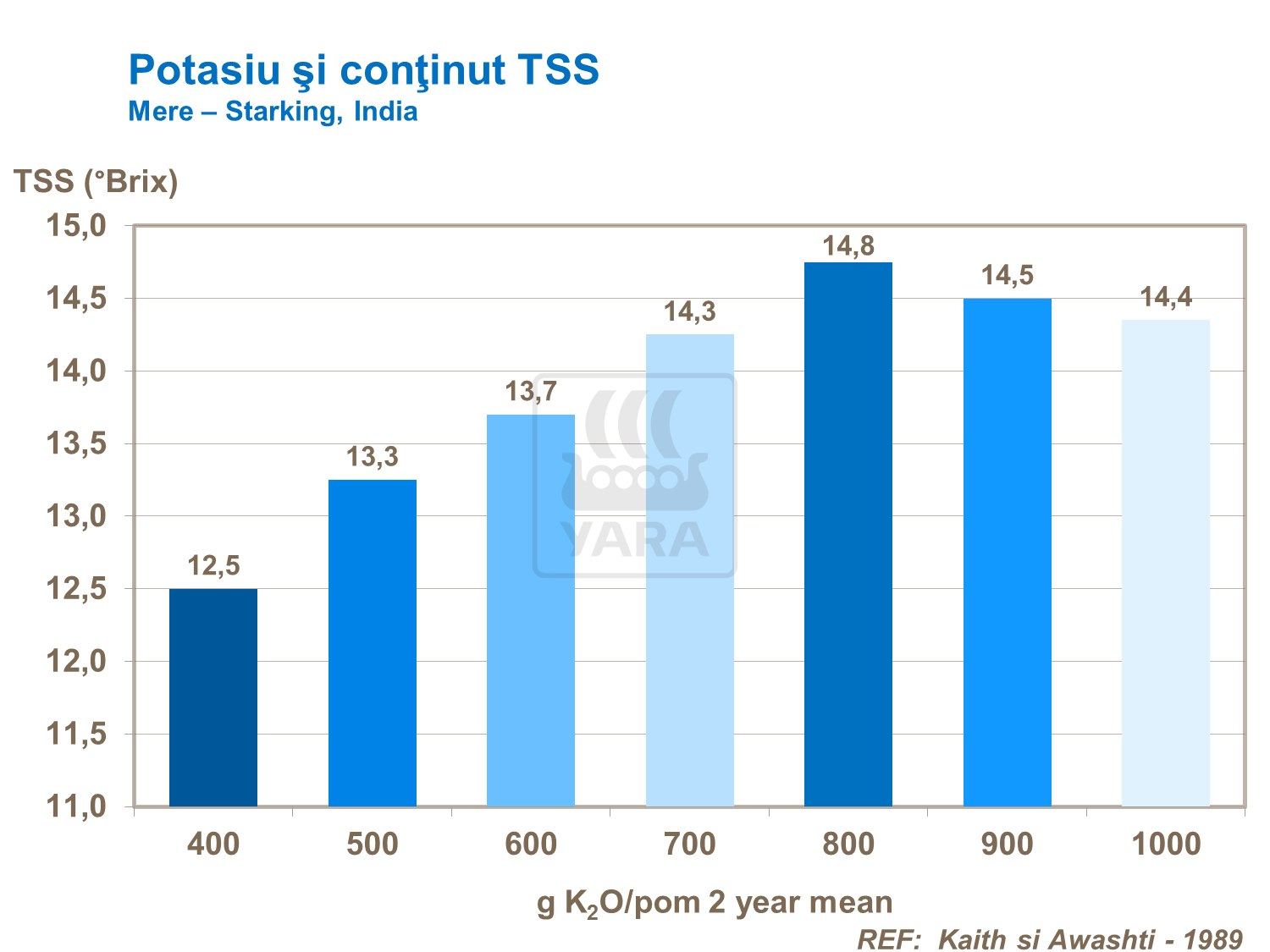 Azotul are un efect pozitiv asupra conţinutului de TSS din fructele seminţoase. Potasiul joacă deasemenea un rol important in determinarea nivelului de dulceaţă a fructelor, aşa cum a fost dovedit prin analize efectuate în India cu măsurare 0Brix. °Brix-ul este folosit pentru aprecierea conţinutului de TSS, deoarece zahărurile solubile reprezintă de obicei 75 – 85% din materialele uscate solubile.