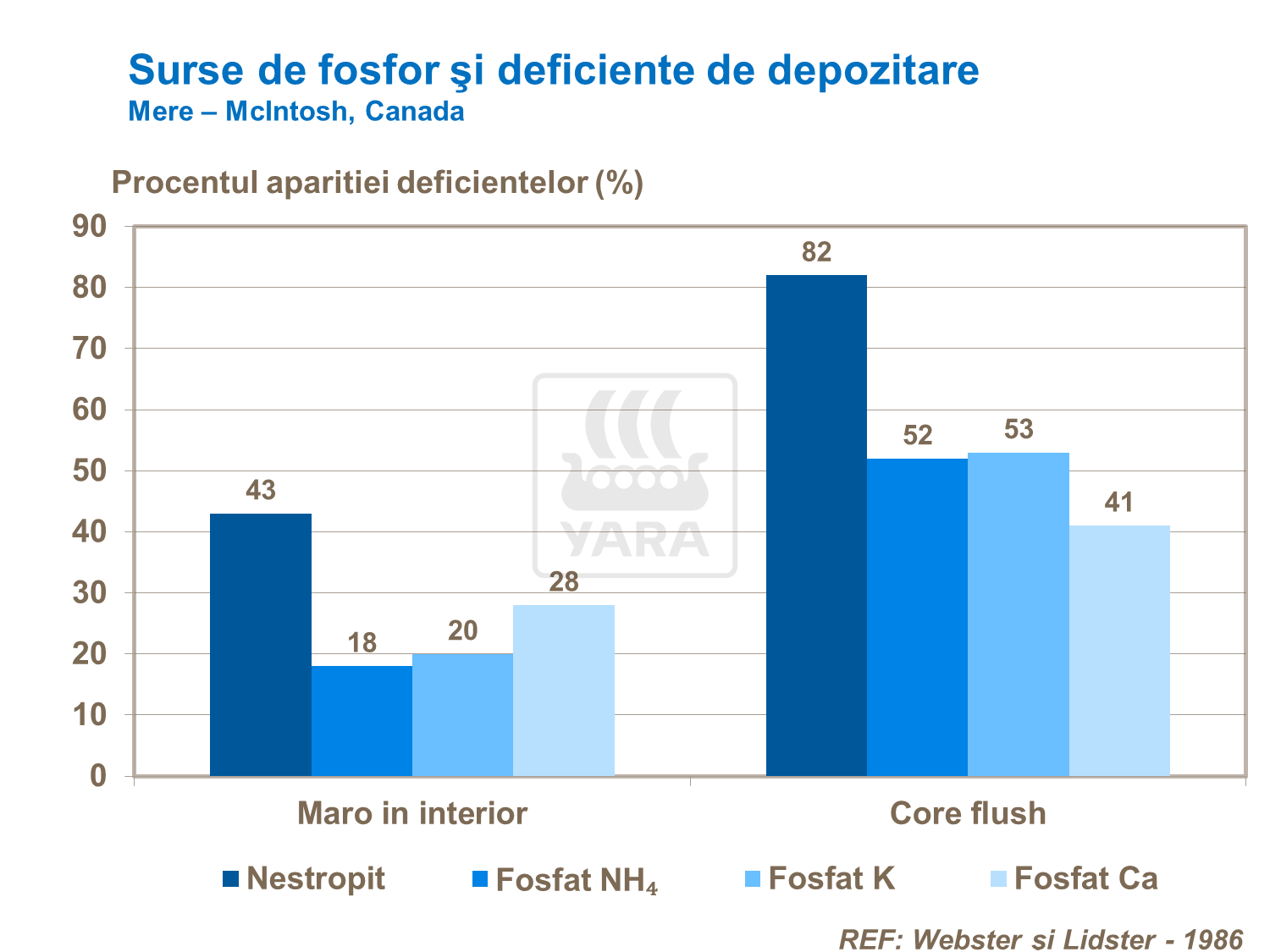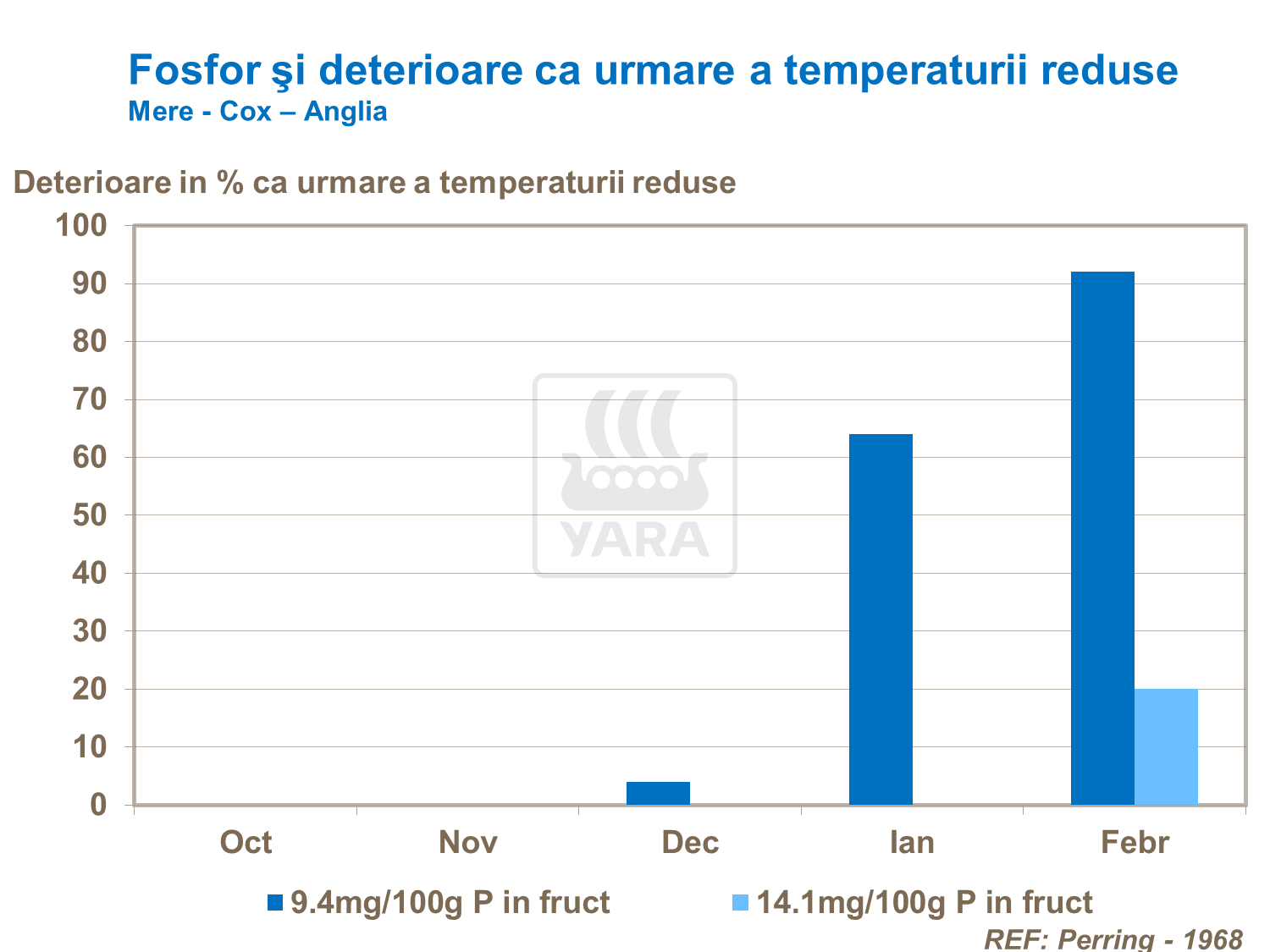 Fosforul contribuie la reducerea riscului apariţiei degradării interioare a fructelor. Cu asigurarea nutrienţilor la plantele seminţoase se poate evita prăbușirea degradării interioarea peretelui celular și degradarea la temperatură scăzută şi se poate minimalize colorarea interioară.