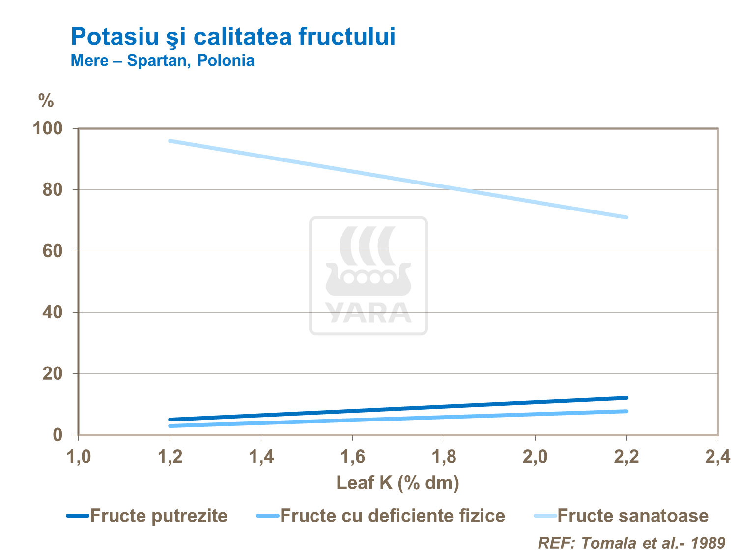Este important ca concentraţia de potasiu să fie în echilibru cu alţi cationi, mai ales cu calciul, deoarece absorbţia potasiului în măsură mai mare decât cea a calciului sporeşte riscul apariţiei fructelor putrezite şi a neregularităţilor fiziologice.