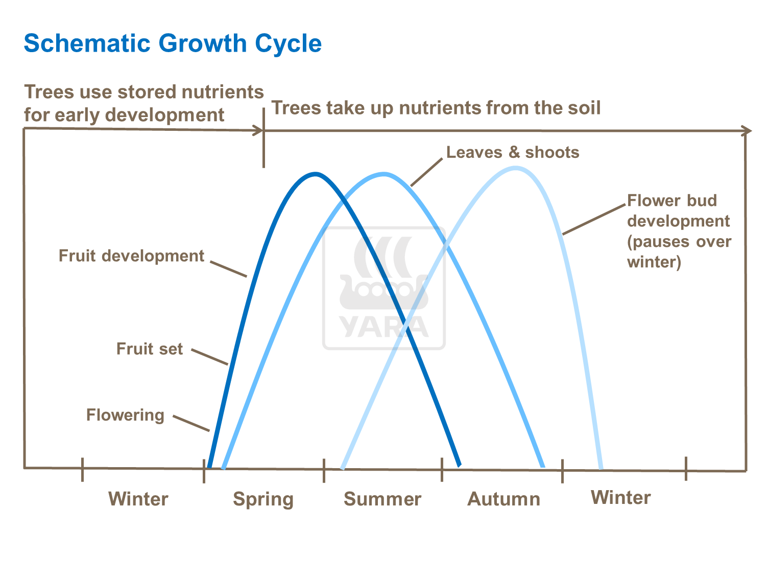 Cele mai multe dintre substanţele nutritive sunt stocate în muguri, în scoarța copacului și în secțiunea de rădăcină. După perioada de iarnă de aici se eliberează substanţele nutritive necesare înlesnirii creşterii frunzelor, înfloririi, formării şi creşterii fructelor. În plus, o parte semnificativă din nutrienții absorbiţi de pomi ajung înapoi în sol în timpul căderii frunzelor, tăierii anuale şi răririi fructelor.