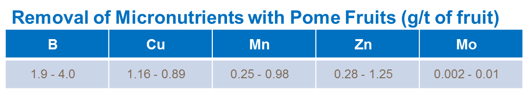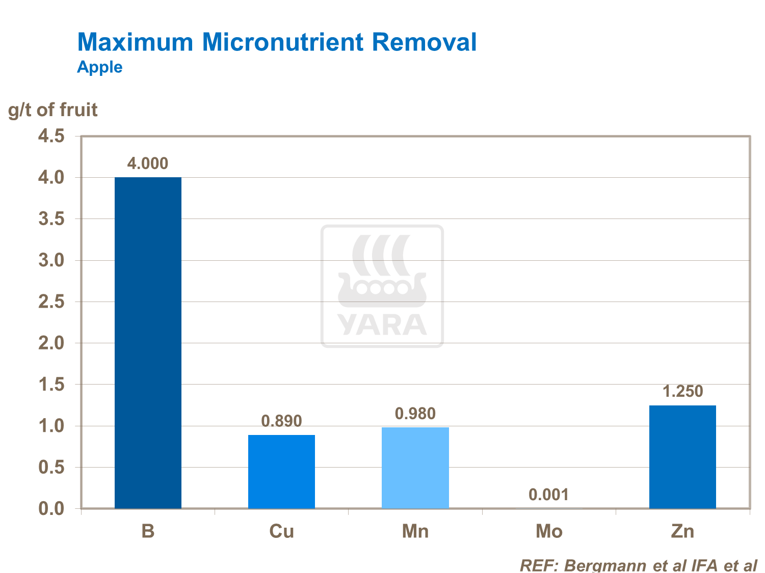 Cu toate că micro-nutrienţii sunt necesari într-o concentraţie mult mai mică pentru asigurarea creșterii corespunzătoare, borul, cuprul, manganul şi zincul sunt elemente cheie în cazul soiurilor de mere.