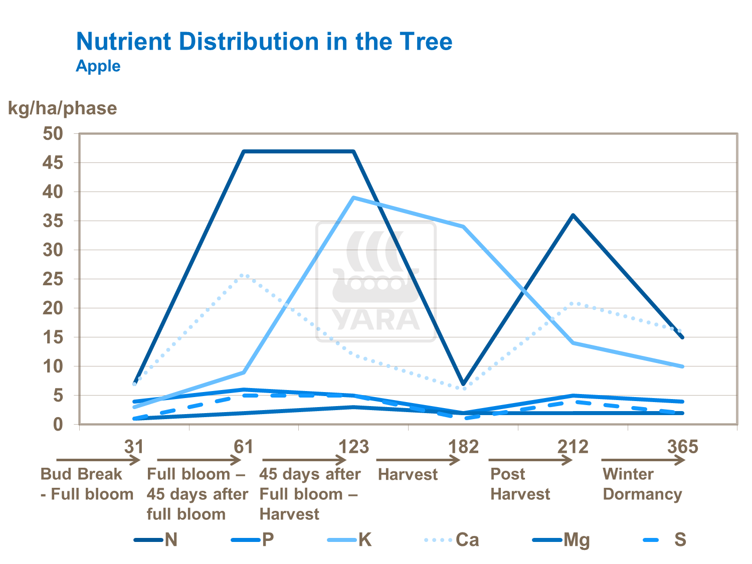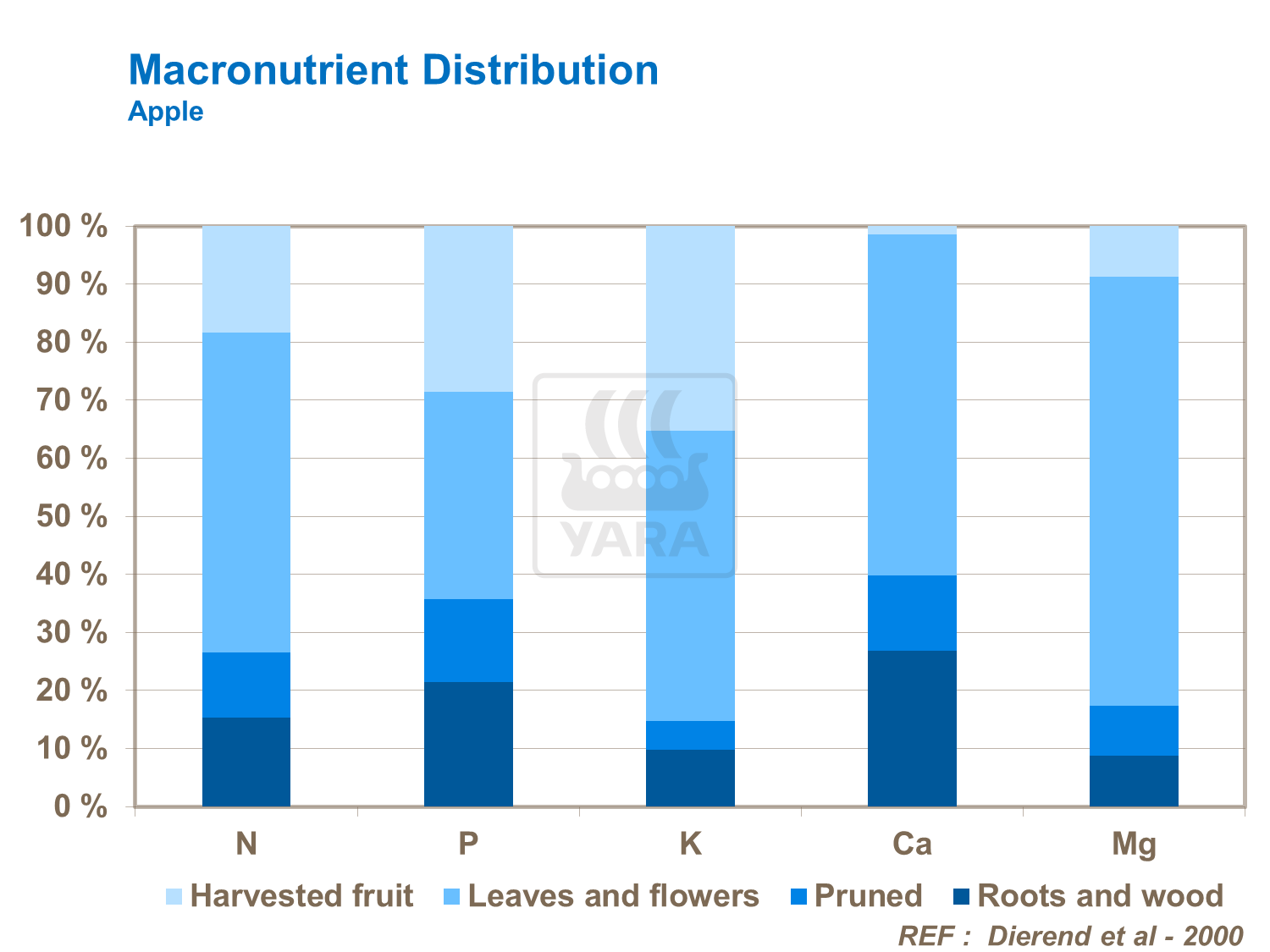 Cei mai importanţi macro-nutrienţi în cazul pomilor cu rodire bună sunt calciul, potasiul şi azotul. Pentru creşterea sănătoasă este necesar ca pomul să conţină o cantitate mare de calciu. Deși din cantitatea totală de calciu ajunge doar o mică proporție în fruct, această concentrație scăzută este de o importanţă critică în minimizarea pierderii de calitate în timpul depozitării. O partea semnificativă din cantitatea de azot va fi utilizată la începutul sezonului, asigurând creșterea vegetativă a frunzelor, înflorirea şi solidificarea fructelor.