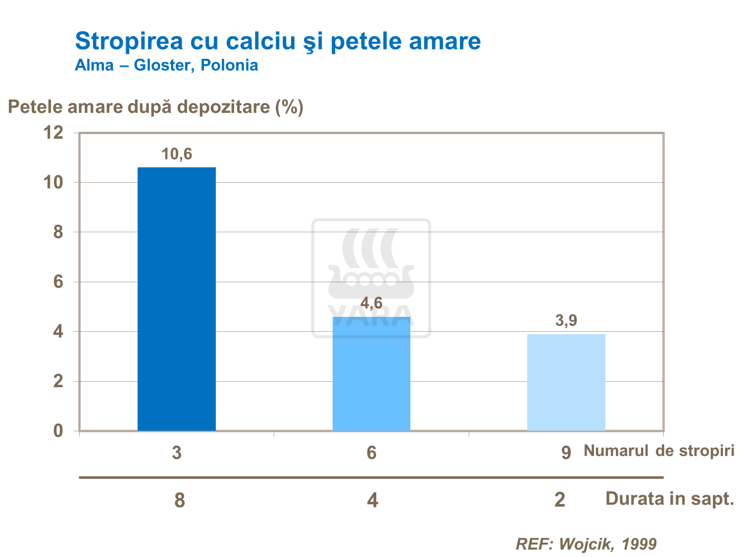 Alimentarea solului este important, trebuie efectuat stropirea fructelor pentru asigurarea conţinutului corespunzător de calciu în fructele seminţoase. Cu cât este mai regular stropirea, cu atât va fi mai bună calitatea fructului. Este important ca stropirea să fie continuată până la recoltare.