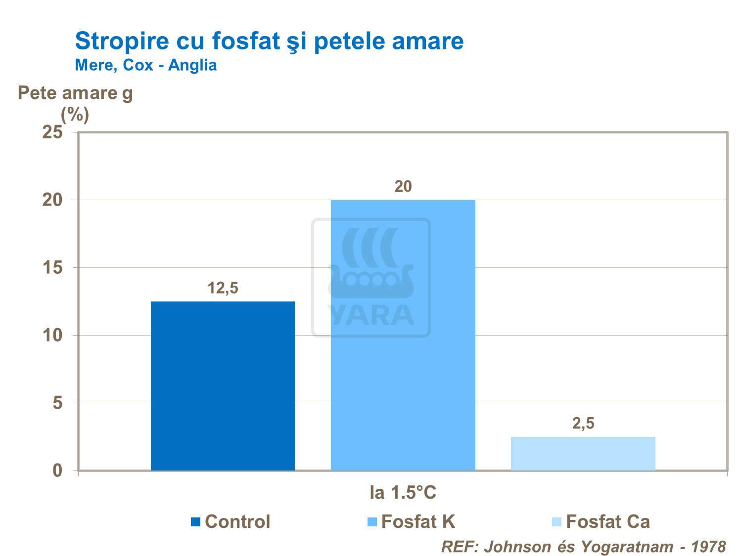 Cercetările au arătat că fosforul îmbunătățește proprietățile de depozitare pe termen lung, şi reduce riscul apariţiei petelor amare. Dar este pretinsă o grijă mare deoarece anumite forme de fosfor pot conține cationi care concurează cu calciul, care ridică riscul apariţiei petelor amare.