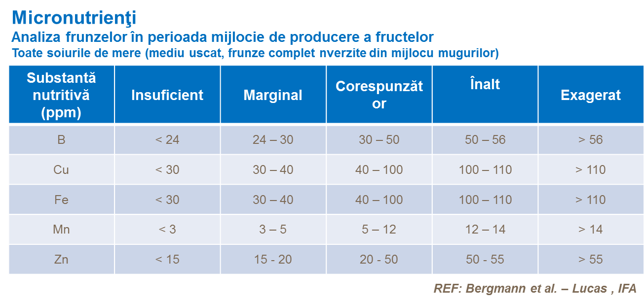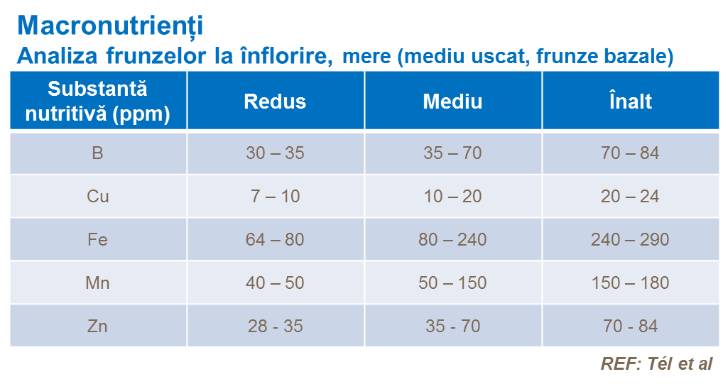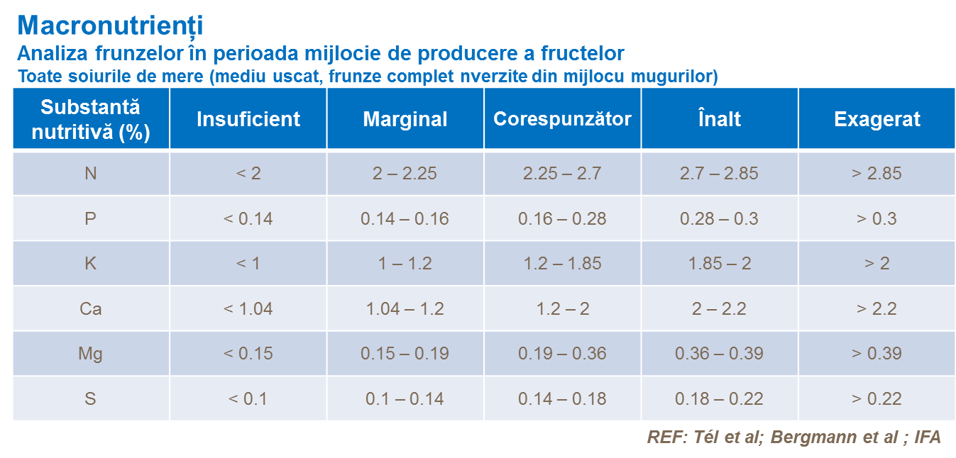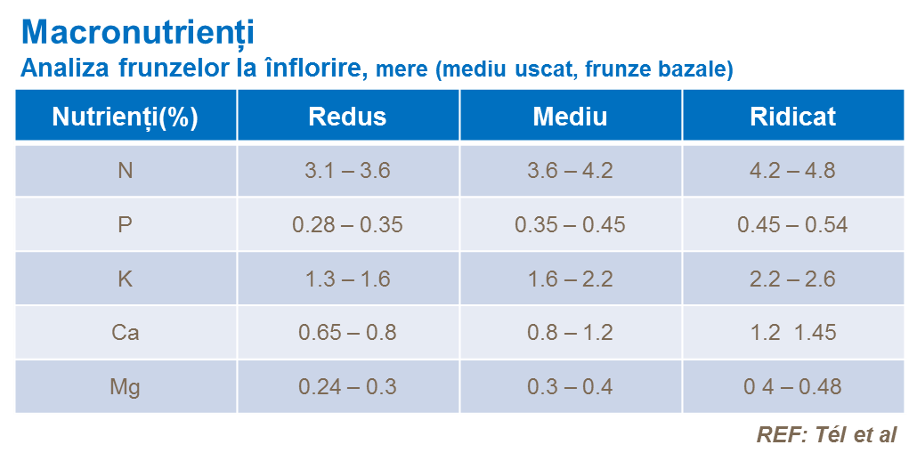 Analiza ţesutului de frunze este o metodă aplicată în cadru mai larg, pentru a primi o informaţie actuală despre starea de nutrienţi în diferite faze de creştere. Valori tipice de analiză a frunzelor pentru creşterea optimă, pentru micro- și macro-nutrienți după etapa de înflorire mai jos.