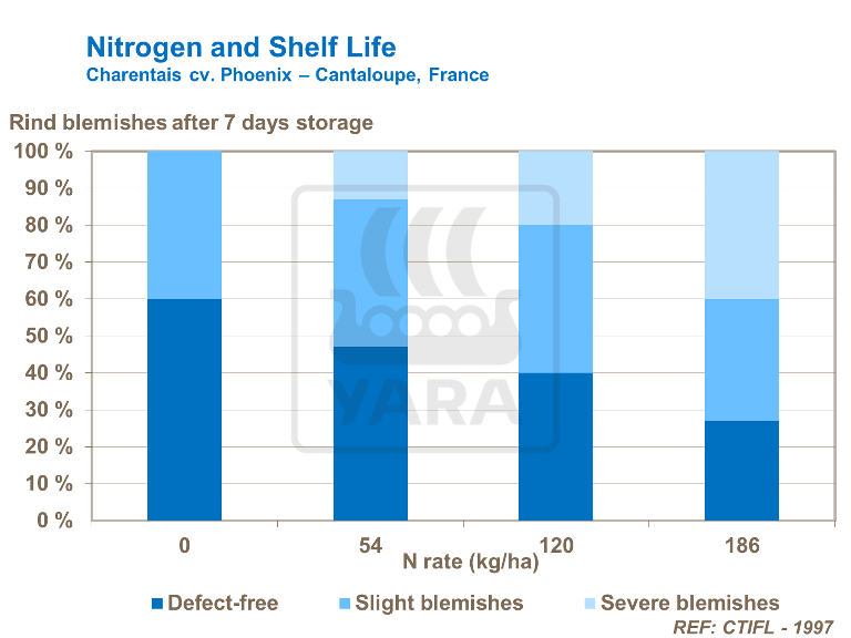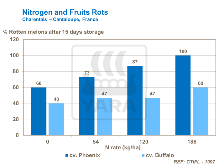 Prea mult azot în etapele târzii de creștere poate strica calitatea fructelor prin creșterea nivelului de striații pe coajă și prin apariția putregaiului de fructe (Figura 12). Astfel, este important să se utilizeze dozle și momentul de aplicare în funcție de analizele locale, care iau în considerare nevoia de randament ridicat, dar și fructe de bună calitate.