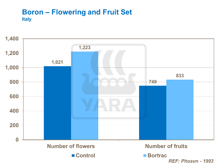 Borul joacă un rol cheie în polenizarea și în formarea fructelor. Deoarece florile de pepene galben sunt doar viabile pentru o perioadă scurtă de timp, este important ca proviziile să nu fie limitate în timpul polenizării. Borul este important în îmbunătățirea mobilității calciului și transportul zaharurilor și a regulatoarelor de creștere a plantelor.