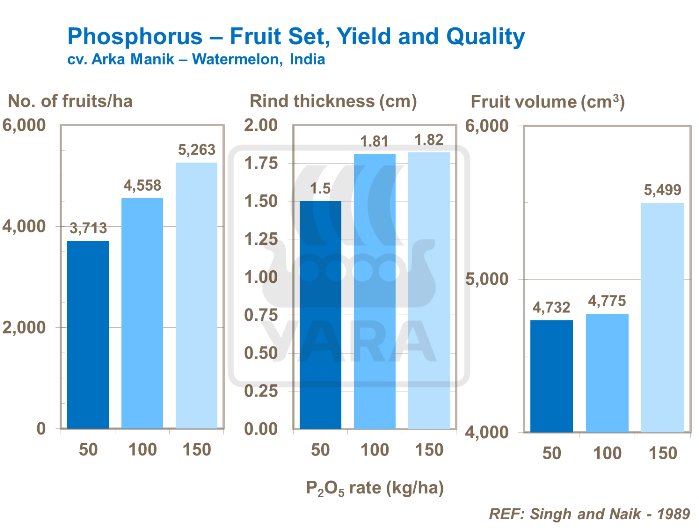 Fosforul este aplicat, în general, timpuriu și până la stabilirea fructelor, asigurându-se că proviziile nu sunt limitative. Fosforul este ușor redistribuit în întreaga plantă. Este deosebit de important să existe un fosfor adecvat înainte de înflorire, deoarece crește cantitatea și greutatea fructelor, încurajând randamentele mai mari și producând coajă mai groasă. Deficiențele pot duce la avortul în floare.