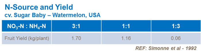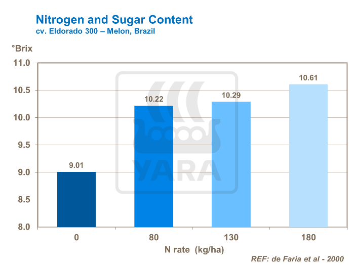 Cantitatea corectă de aprovizionare cu azot este importantă pentru stimularea creșterii frunzelor și a sintezei zahărului, îmbunătățind calitatea fructelor. Forma de azot este deosebit de importantă și este esențial să se mențină un echilibru bun între formele de amoniu și nitrat pentru a menține o creștere rapidă și o bună productivitate a culturilor. Încercările confirmă reduceri semnificative ale absorbției de azot prin frunze și pierderi de randament datorate utilizării îngrășămintelor azotoase cu o proporție prea mare de amoniu comparativ cu nitrații. Calitatea culturilor se deteriorează de asemenea.