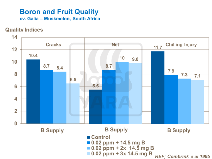 În cazul în care aportul de bor nu este limitat, coaja este mai elastică, reducând astfel riscul de crăoare și îmbunătățind păstrarea. Lipsa de bor sau insuficiența conduce la un gol al fructelor in mijloc și este de asemenea, cauza obișnuită a fisurilor interne. Este mai frecventă în pepenii care au o formă mai lungă și subțire (pepenoiace).