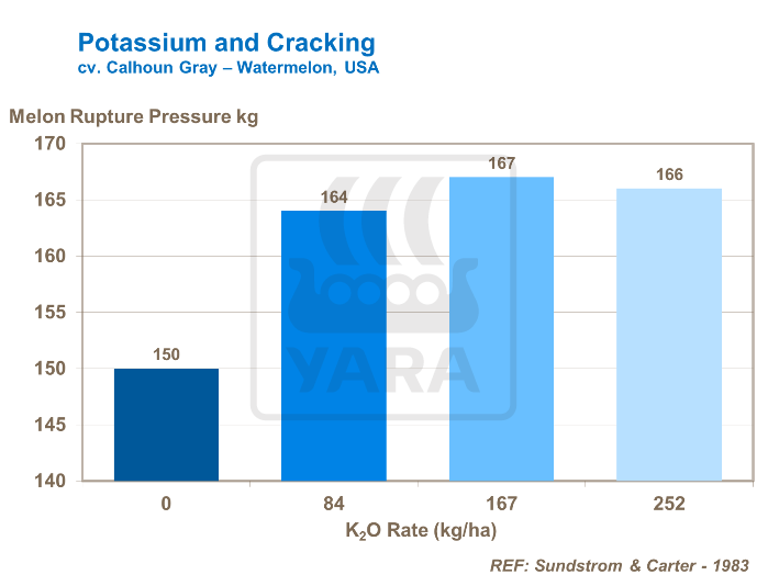 Cantitatea mare de potasiu este critică pentru minimizarea crăpării prin îngroșarea cojii. Este deosebit de important pentru calitatea fructelor și reducerea riscurilor de fisurare a pepenilor și a daunelor în timpul transportului.
