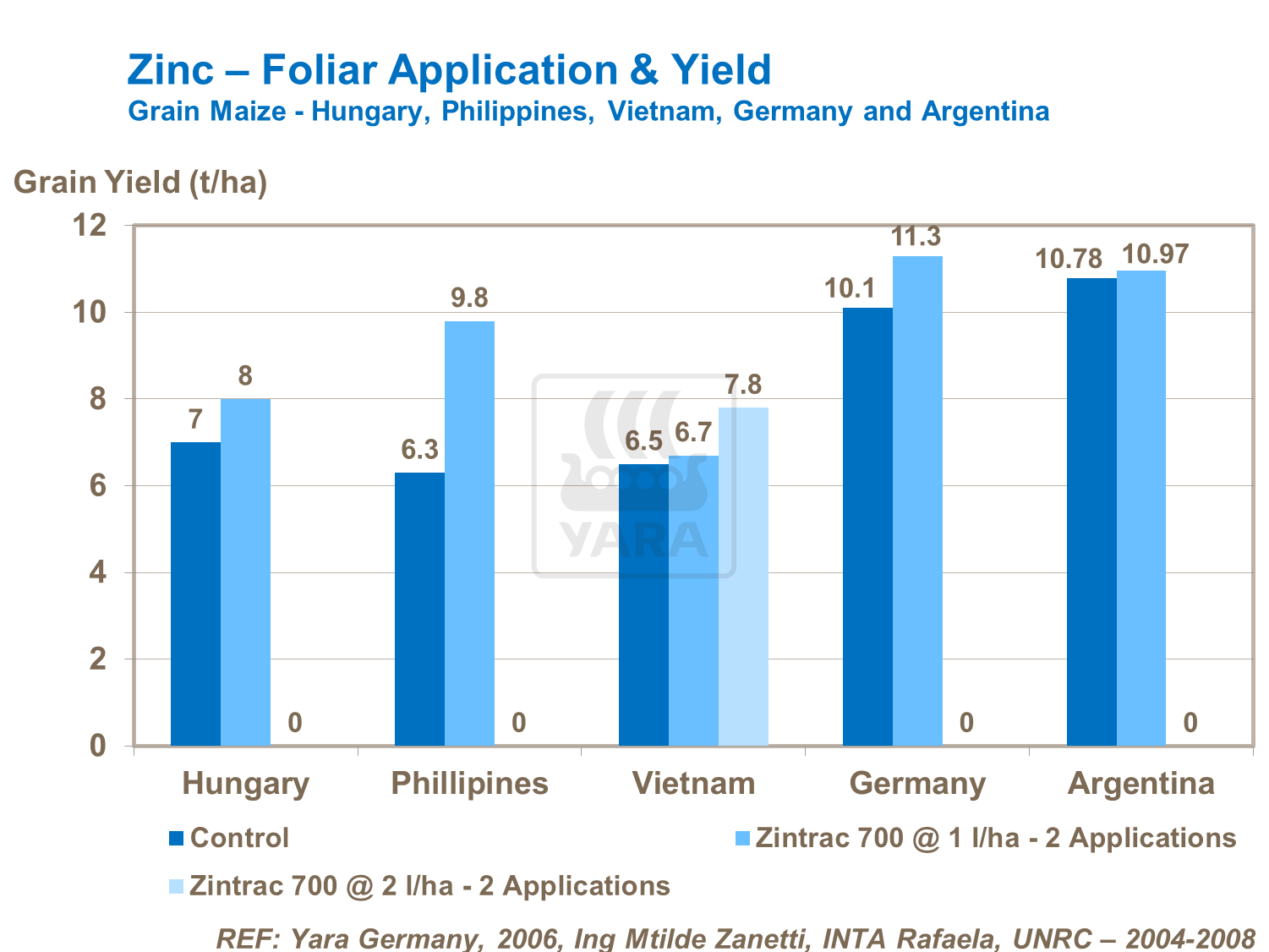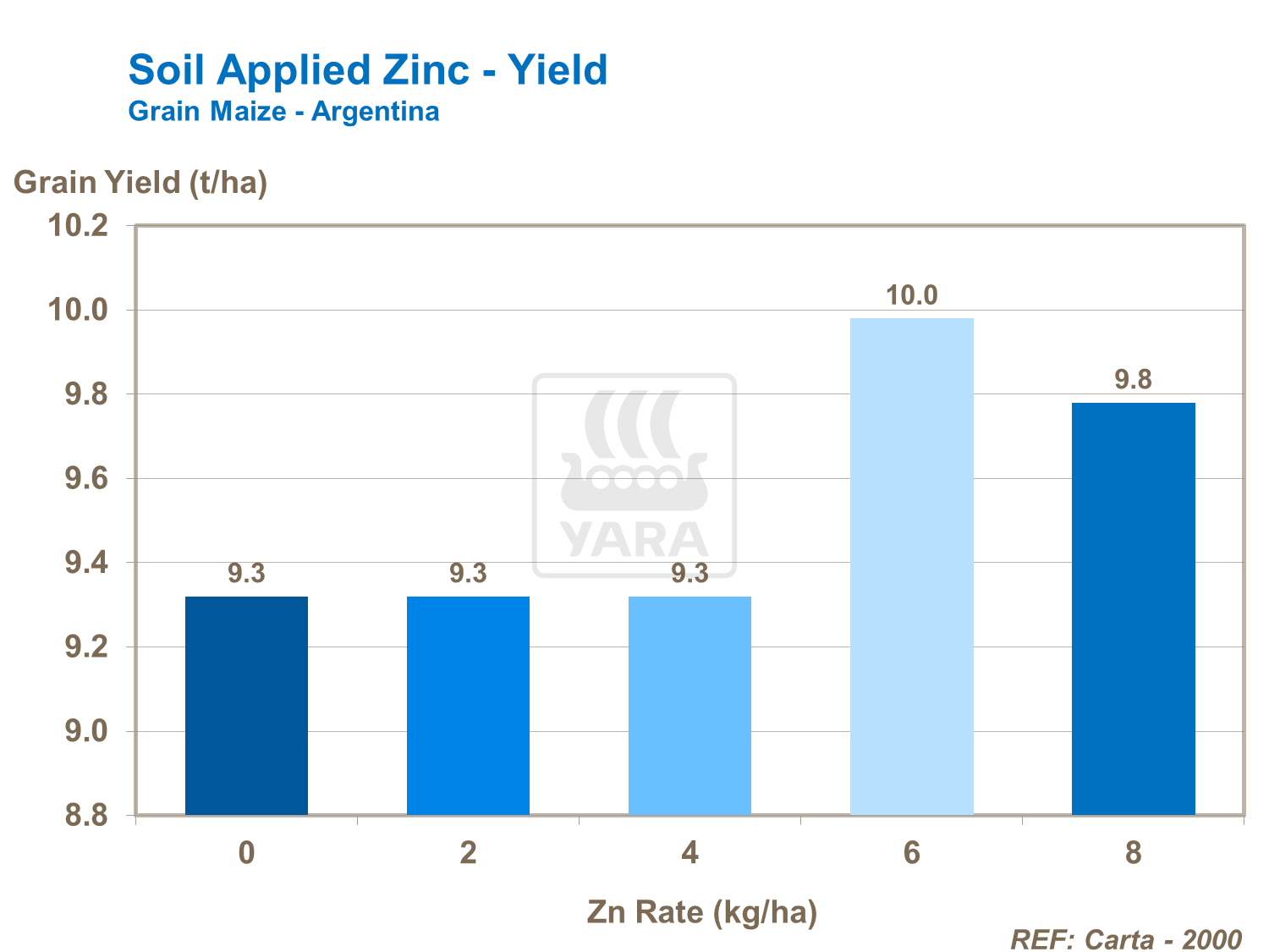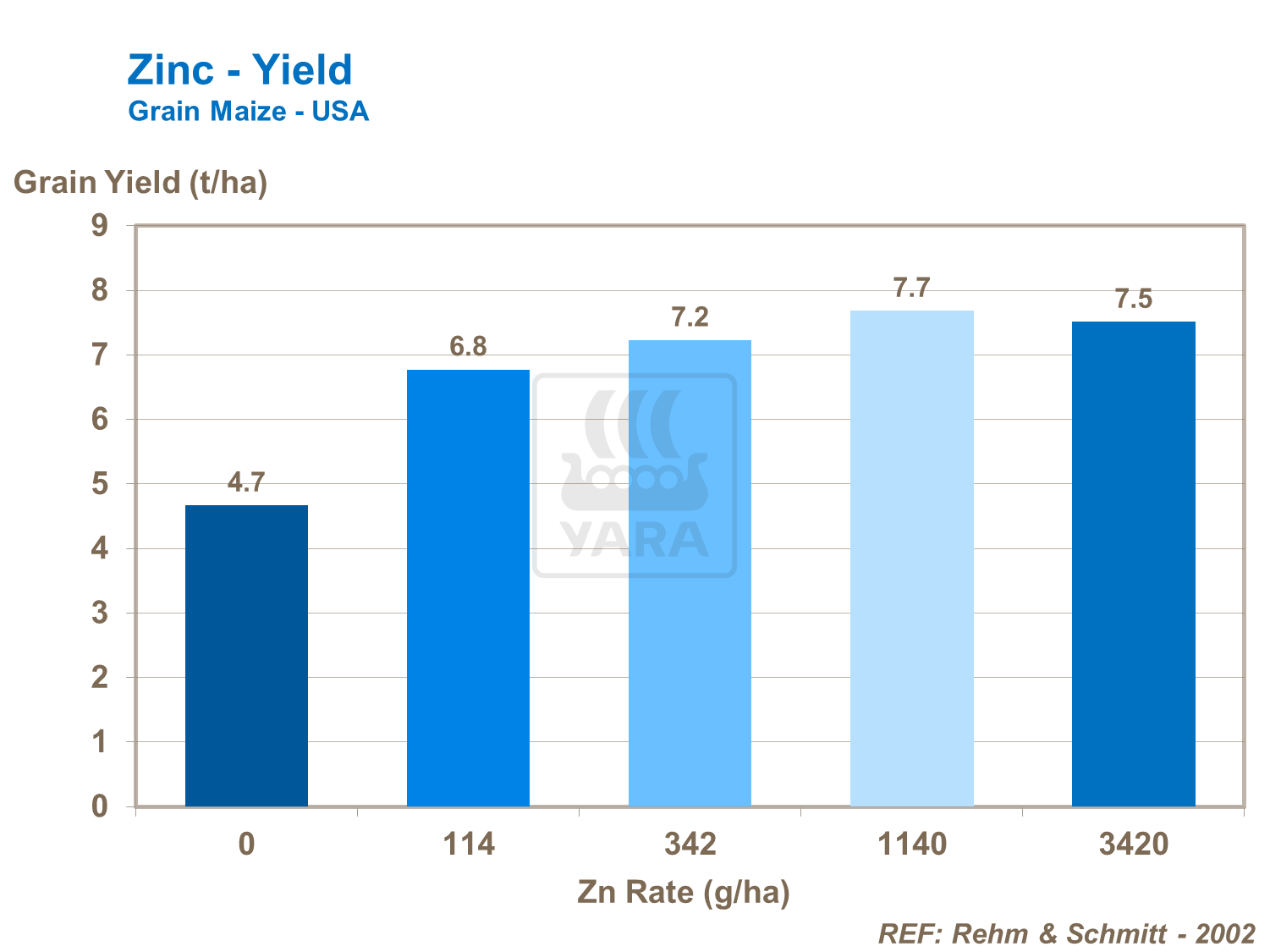 Majoritatea studiilor a arătat o influenţă sensibilă a zincului asupra randamentului. Aplicarea zincului la sămânţă provoacă o reacţie puternică, având efect asupra rădăcini şi vlăstarelor, respectiv asupra creşterii ulterioare a frunzelor. În acelaşi timp un randament ridicat se poate obţine şi prin aplicarea foliară a zincului.