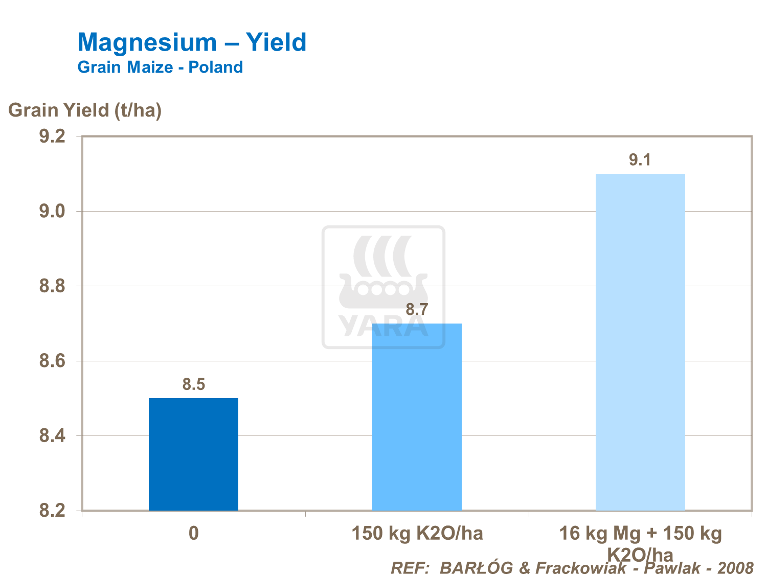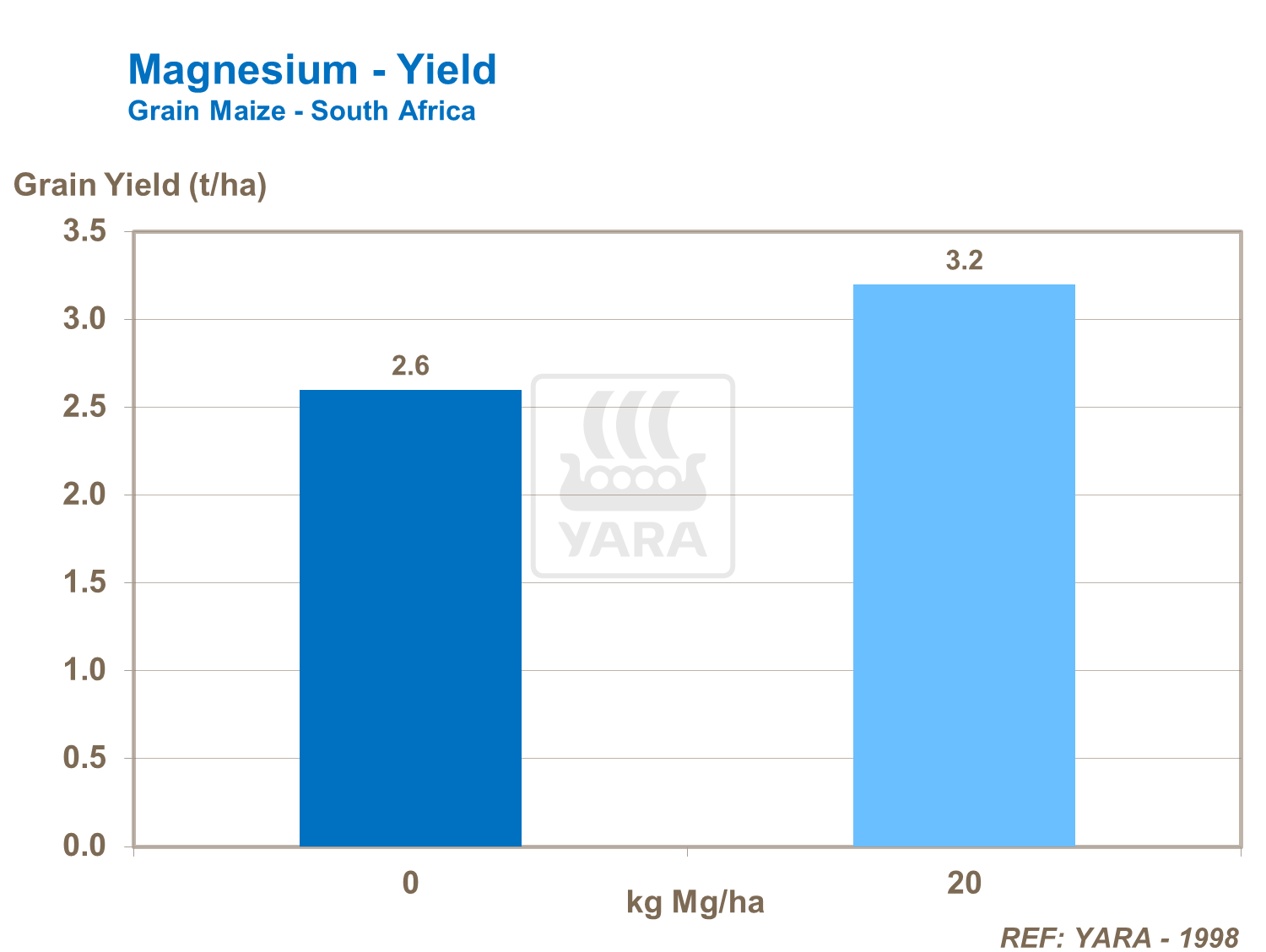 Aportul de magneziu este necesar în perioada de vârf a creşterii, cel mai intensiv în perioada de dezvoltare V5. Asimilarea constantă de magneziu este necesară creşterii. În cazul unui sol sărac în magneziu aplicarea magneziului contribuie la o mai bună creştere şi la un randament mai mare.