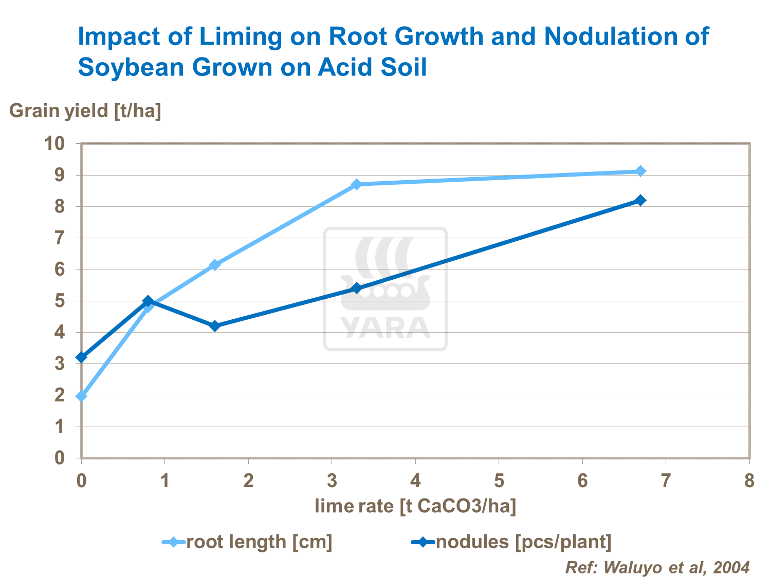 Menținerea unui nivel adecvat al pH-ului solului asigură disponibilitatea nutrienților și maximizează randamentul. Pentru soia, cel mai bun nivel de pH este 6. La valori scăzute ale pH-ului, pot apărea toxicități de aluminiu și probleme de mangan, reducând rădăcinile și dezvoltarea plantelor.