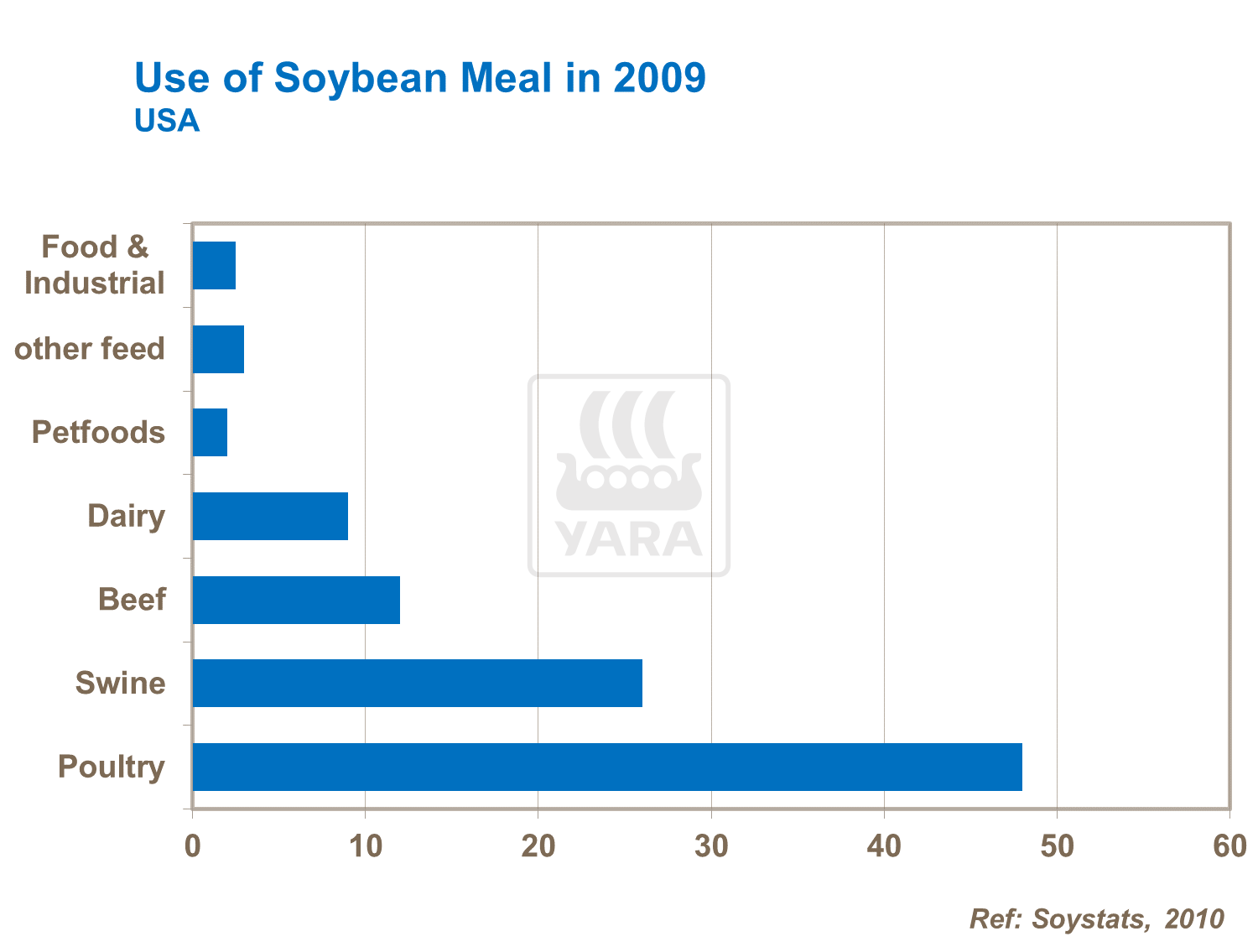 Făina de soia, cu 50% proteină de soia, este utilizată pentru hrana animalelor, cum ar fi păsările de curte, porcine și pentru sectorul acvaculturii.