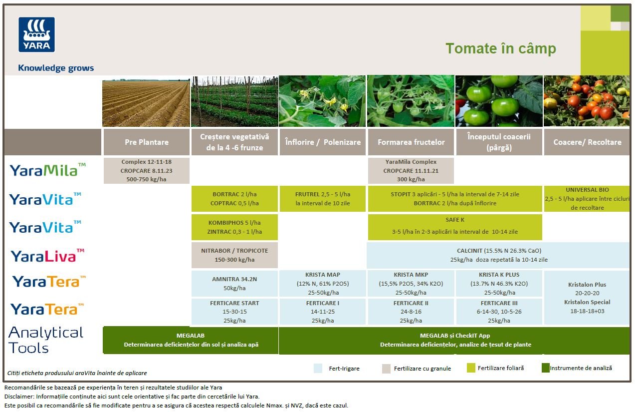 Realizat de specialiștii noștri, programul de fertilizare a tomatelor Yara vă poate ajuta să obțineți performanțe excelente. Dați clic pe imagine pentru a vizualiza mai mare sau descărca: Programul de fertilizare în format PDF (0.5MB).