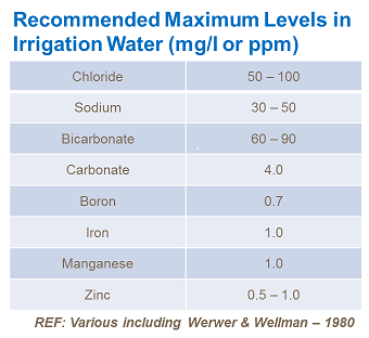 Producția de sticlă necesită volume mari de apă, iar producătorii trebuie să ia în considerare substanțele suspendate și dizolvate atunci când planifică programe nutriționale. Anumiți nutrienți sau compuși găsiți în apa de irigare pot afecta în mod negativ creșterea plantelor, iar nivelurile trebuie luate în considerare (Tabelul 6). Altele, de ex. Calciu și magneziu pot ajuta la satisfacerea unei proporții de necesități de îngrășăminte.