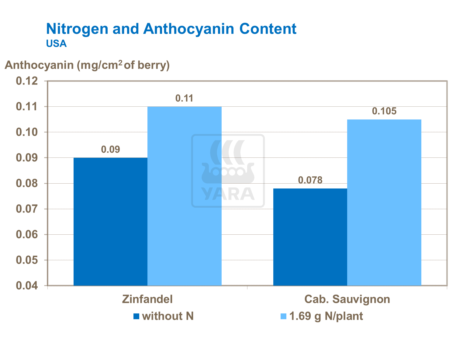 Creșterea fertilizării cu azot mărește conținutul de antocian în pieliţa boabelor de struguri, crescând intensitatea culorii vinului. Dar nivelurile ridicate de azot pot determina creșterea viguroasă și umbrirea, mărind dimensiunea boabelor, reducând astfel raportul dintre pielita și celuloză.