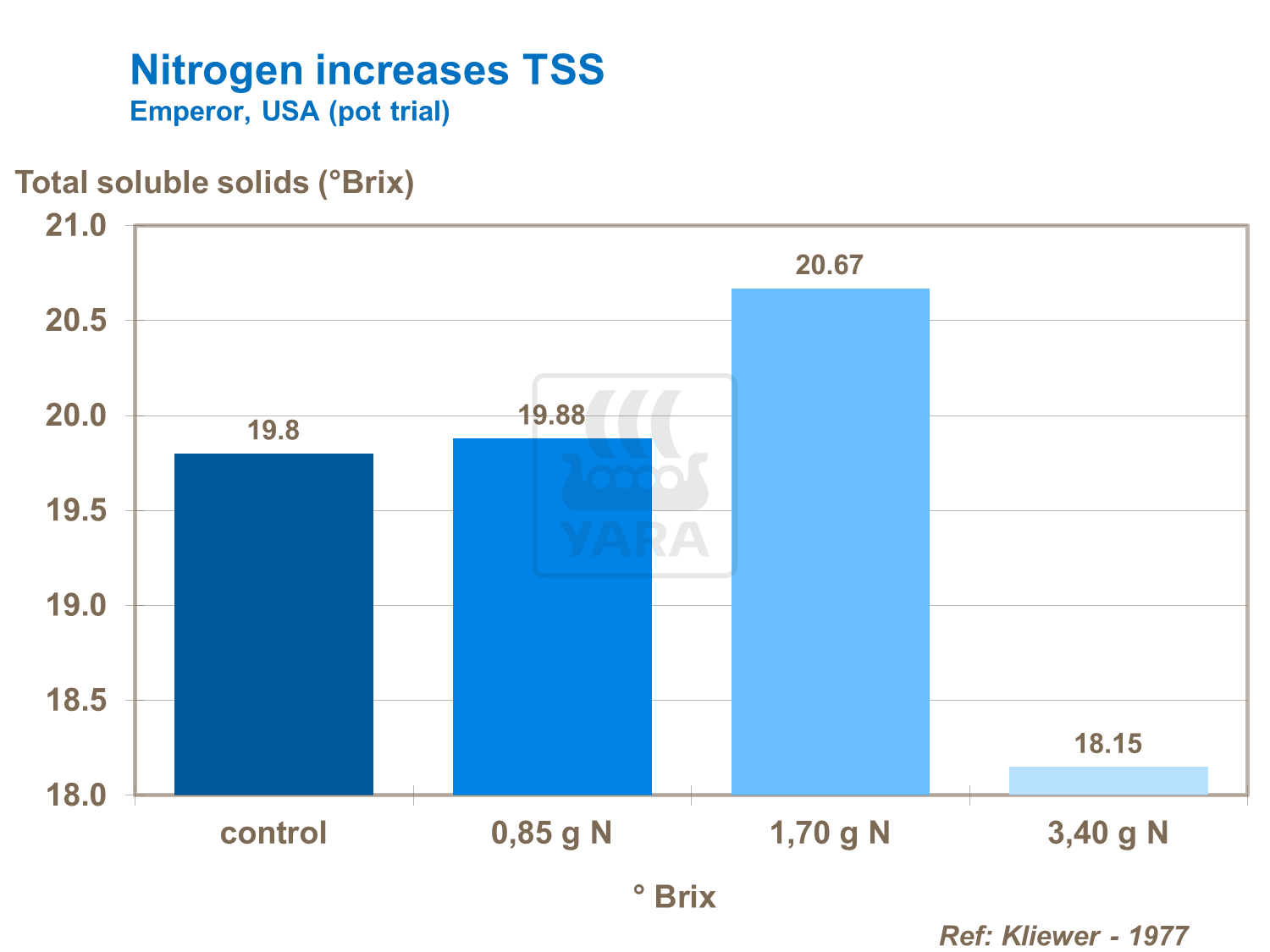 Având în vedere aspectele nutriționale, cu cât mai mare este disponibilitatea azotului, cu atât este mai mare conținutul de zahăr din struguri și producția potențială de alcool după fermentație, precum și zaharurile reziduale din vin, măsurate cu °Brix. Până la anumite niveluri, utilizarea de azot mărește conţinutul de zaharuri.