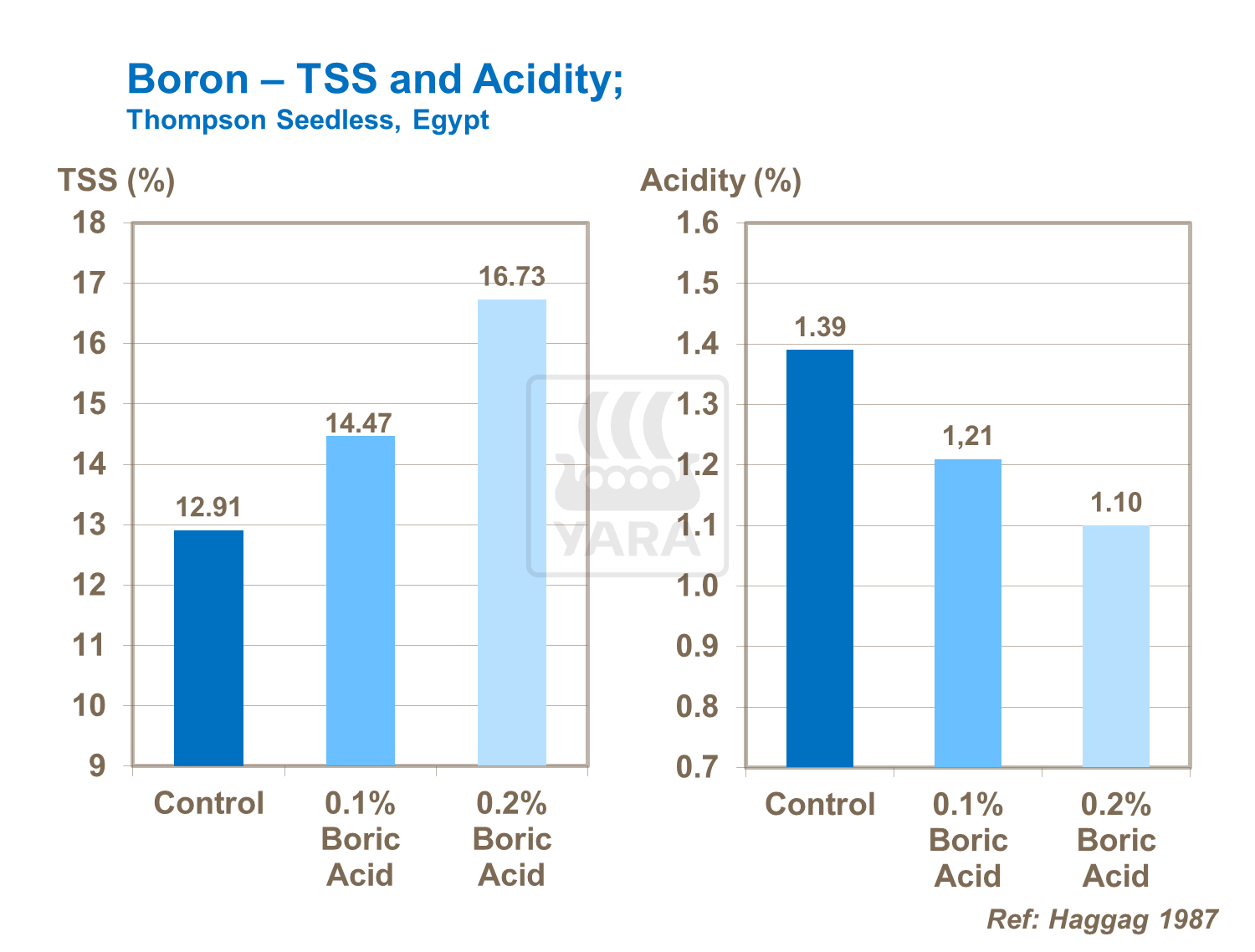 Borul și zincul aplicate foliar contribuie, de asemenea, la îmbunătățirea calității strugurilor prin creșterea conținutului de zaharuri TSS și reducerea acidității.
