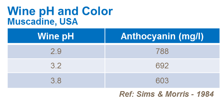Astfel, este important să se obțină echilibrul adecvat al potasiului în struguri. În Franța, de exemplu, nivelurile de potasiu acceptate în mustul vinurilor franceze se situează între 1-2,5 g/l, rezultând în vinul final 0,7-1,6 g/l. Valorile ridicate ale pH-ului pot, de asemenea, să modifice culoarea soluțiilor de antocianină - responsabile pentru culoarea vinului roșu - prin schimbarea structurii moleculei de antocianină, care devine mai albastră și prin urmare mai puțin de dorit.