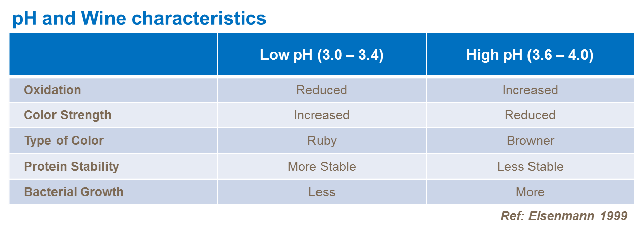 Un pH ridicat trebuie să aibă ca rezultat vinurile care au un gust plat și vinurile roșii cu o culoare maronie. În general, un pH mai mare decât 3,6 este nedorit deoarece poate avea un efect negativ asupra unei serii de caracteristici ale calității vinului.