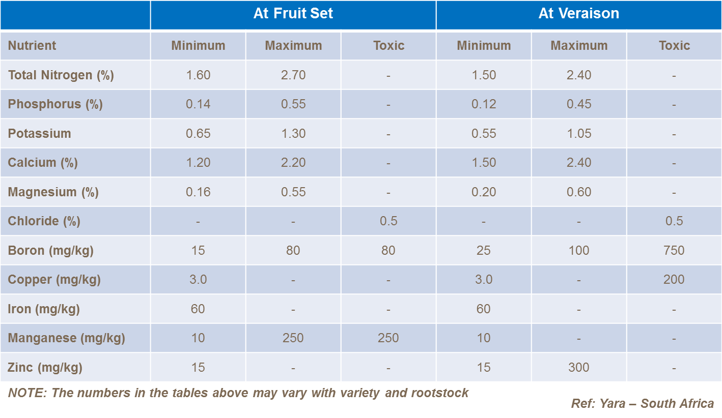 Cea mai obișnuită practică este de a testa la schimbarea culorii boabelor sau la sfârșitul înfloririi. Unele sisteme sugerează prelevarea de probe în ambele etape. Sunt necesare cel puțin 30 de mostre de frunze/pețioluri care se află cel mai aproape de ciorchine.